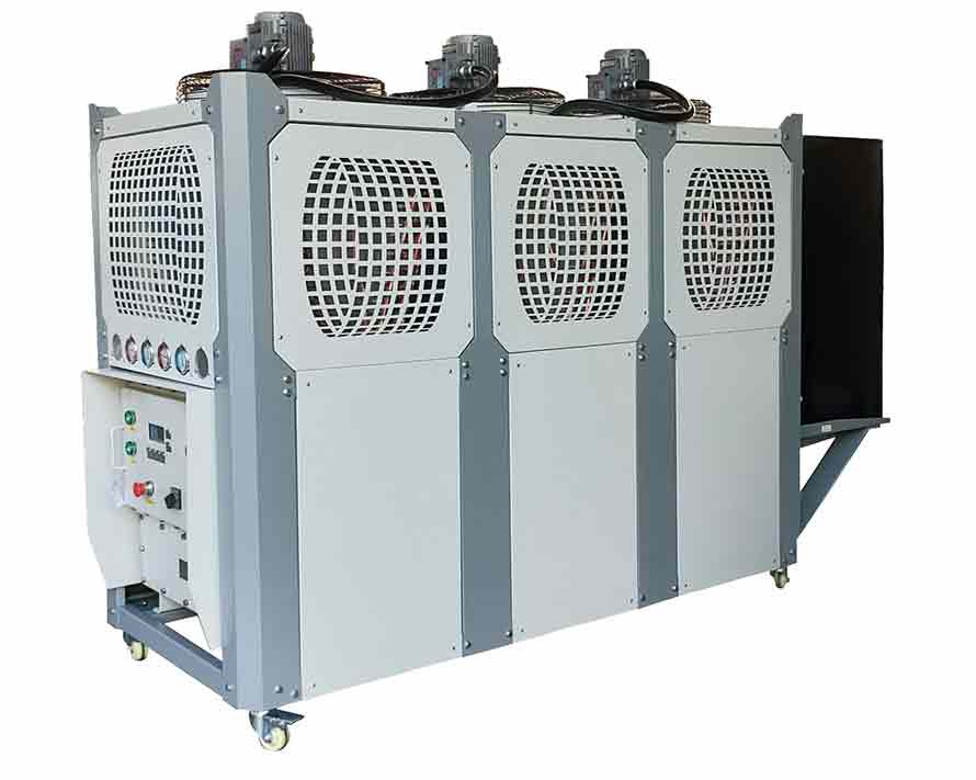 風冷式防爆型反應釜專用冷水機通過風扇以空氣為冷凝方式的控溫設備,有箱式和螺桿式,單機輸出馬力從1HP~220HP..