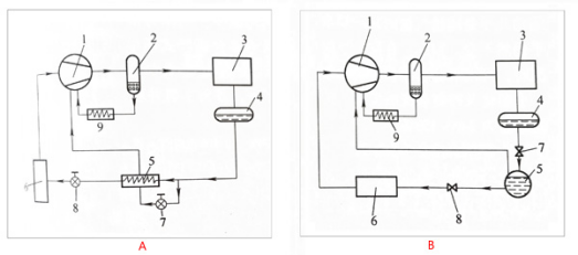 帶有經濟器的螺桿式冷水機的制冷系統有一次節流和二次節流兩種形式,如下圖所示:對于一次節流系統(下圖中的A所示),來自貯液器4的制冷劑液體分為兩路,主要的一路從經濟器5中的盤管內流過,放出熱量而過冷,然后經節流閥8節流后,進入蒸發器6中制冷;另一路經過節流閥7降壓后,進入經濟器5中吸熱而產生閃發性氣體,經過螺桿式壓縮機機體上的中間補氣口,進入到正處在壓縮初始階段的基元容積中,與來自蒸發器的氣體混合繼續被壓縮。
